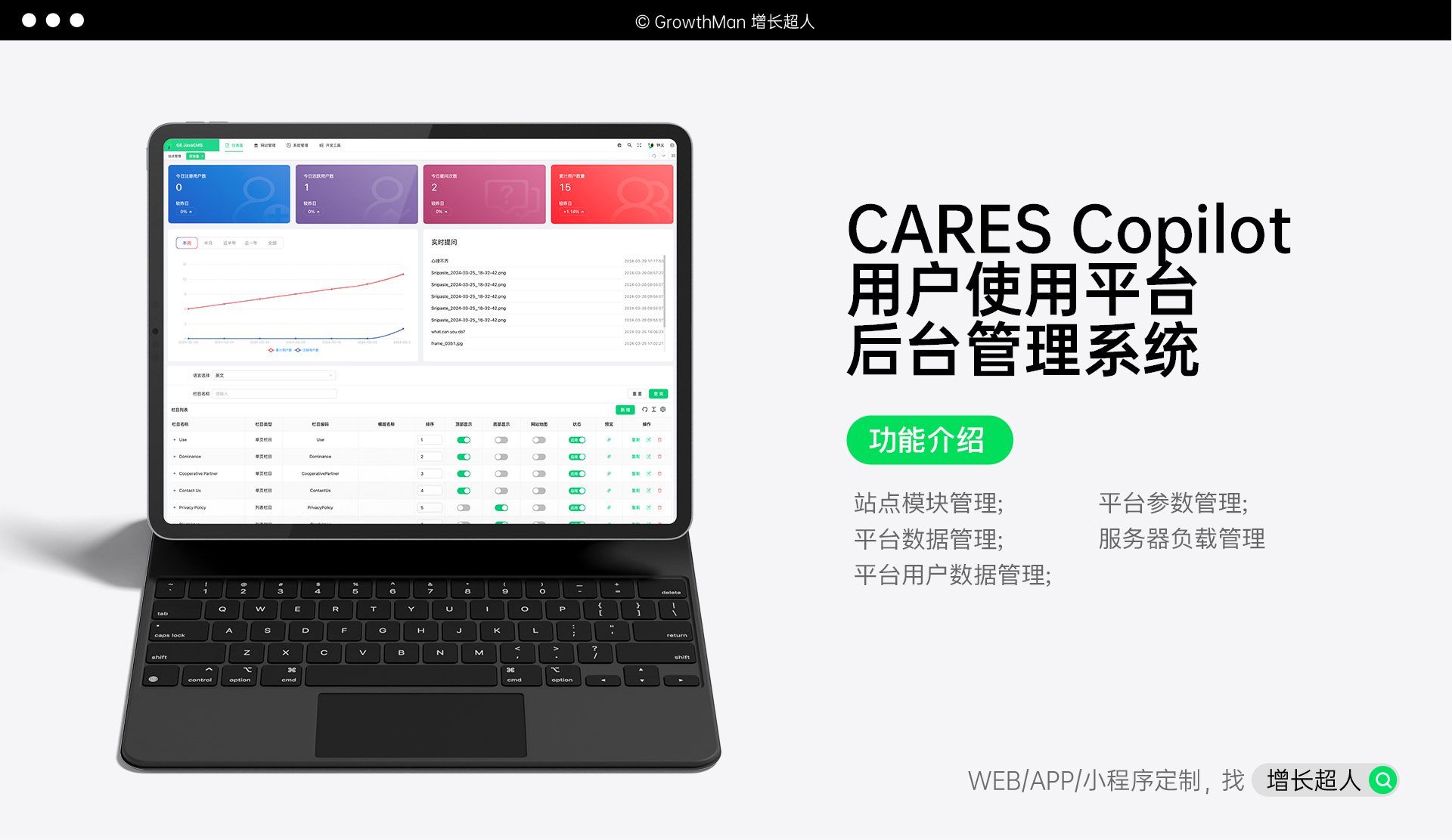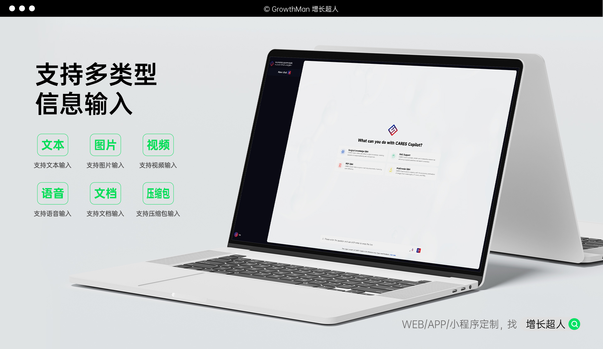 增长超人很高兴能与中国科学院香港创新研究院共创CARES Copilot用户平台。并努力通过我们的技术实力和项目经验,帮助香港创新研究院和医护人员实现人工智能和医疗行业的深度对话。