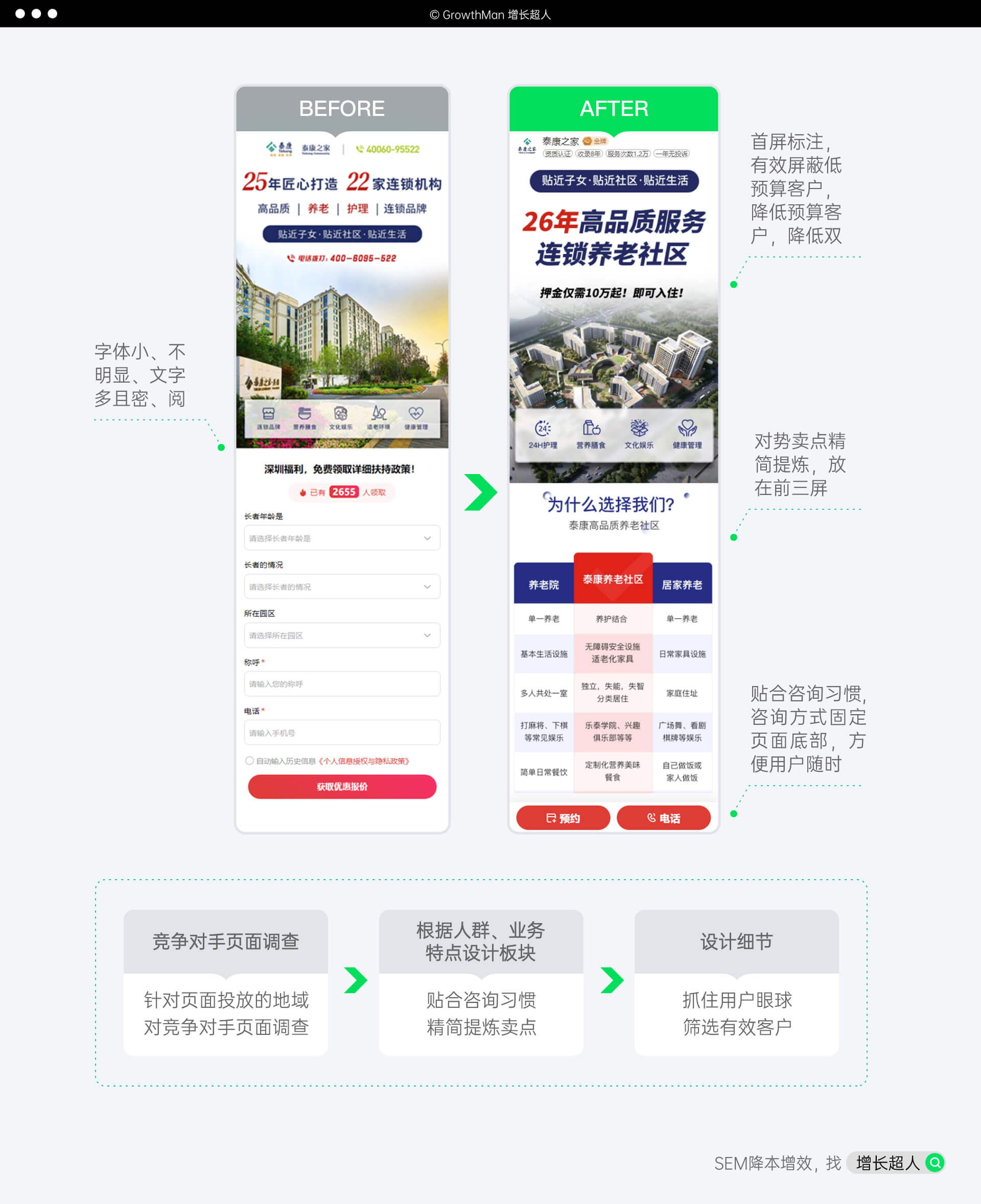 增长超人为其进行了落地页分析,从泰康之家的客户需求出发找准痛点,对比竞对优势形成差异化,打造高转化率落地页,MQL线索量提高198%。