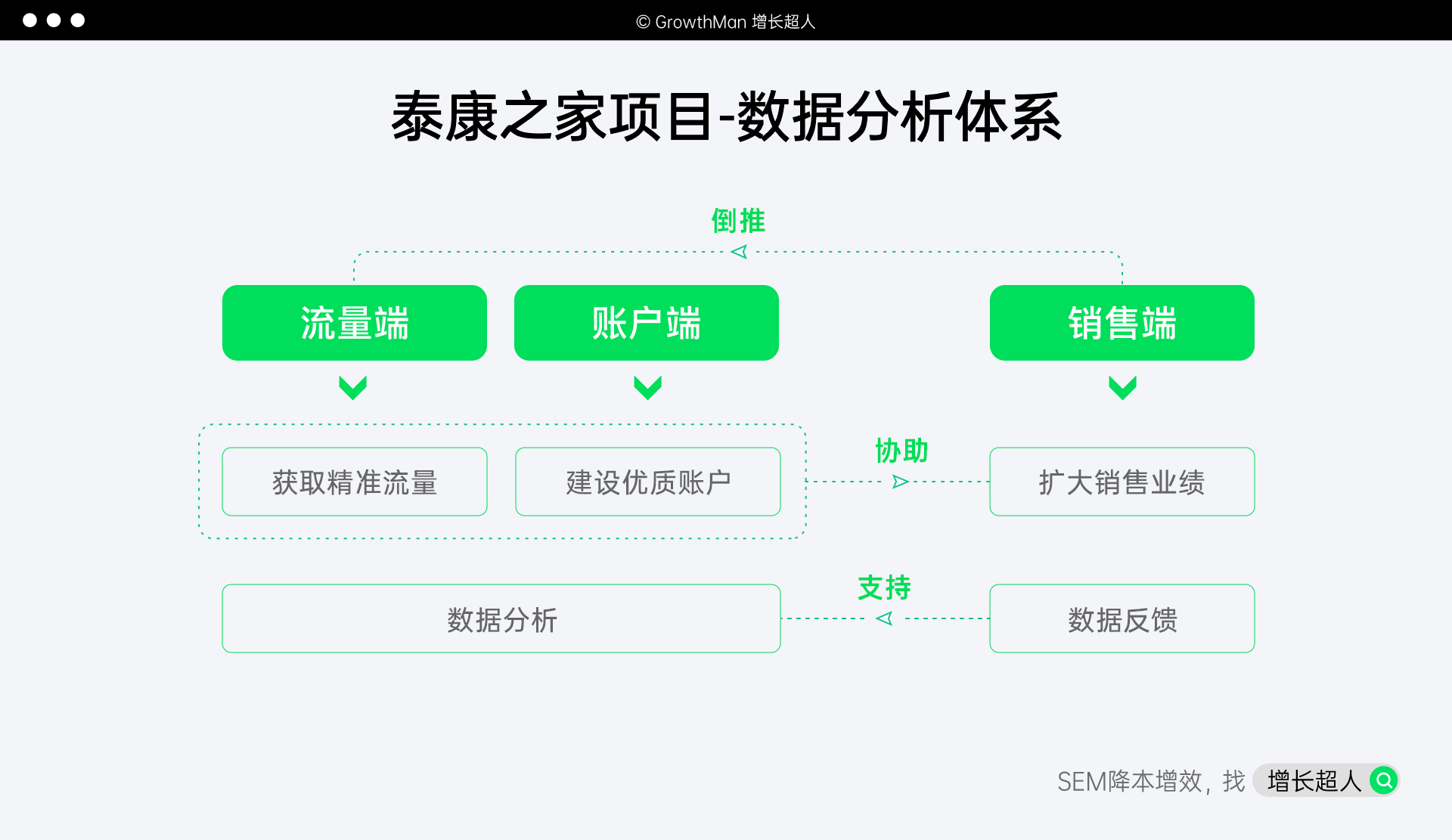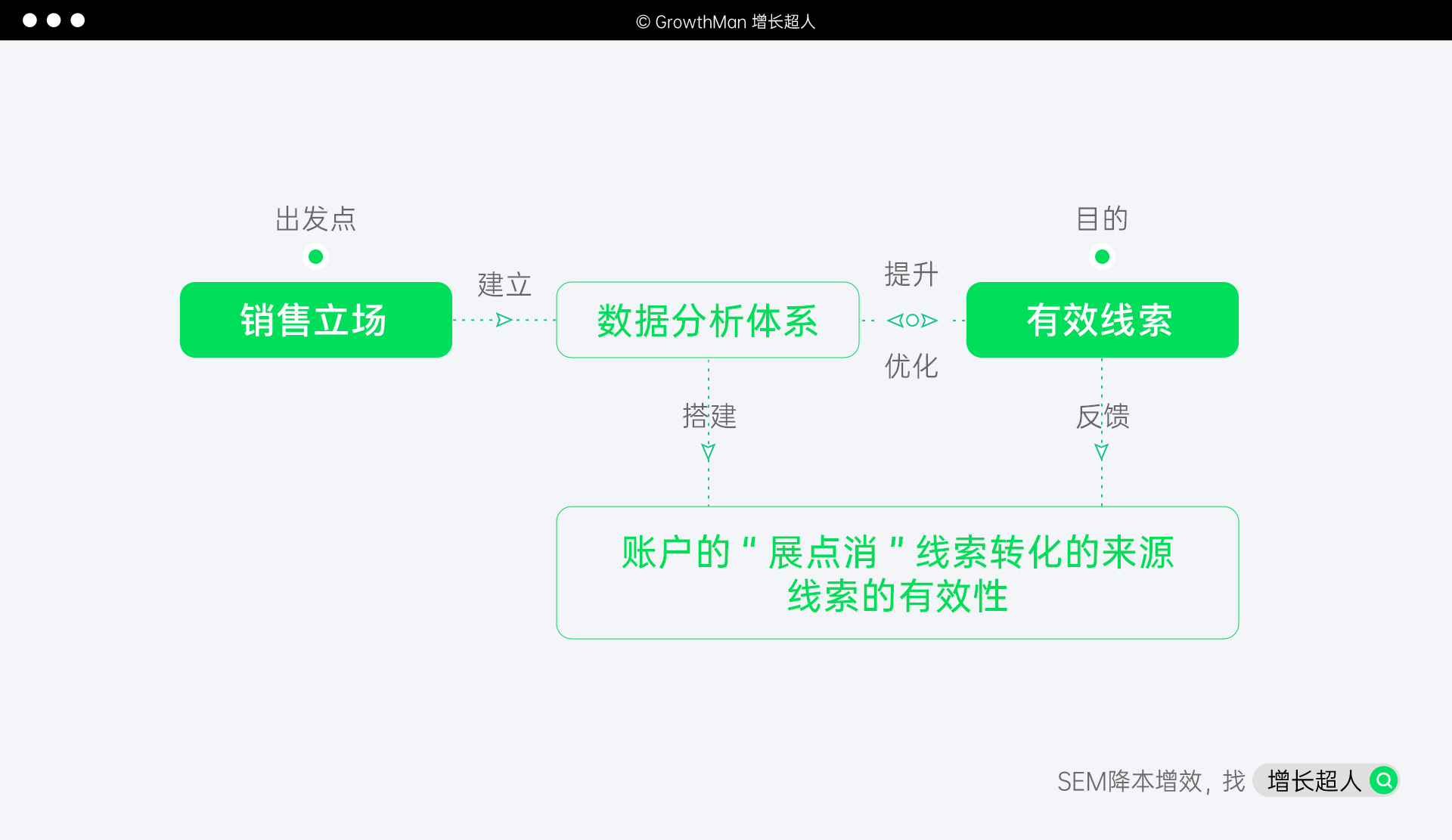 增长超人的数据分析体系是由流量端到账户端再到销售端组成的,三个端口分别负责获取精准流量、建设优质账户、扩大销售业绩。许多普通的运营员仅限于对流量和账户的初级数据分析,不考虑销售端口的数据反馈,实则是在“自嗨”。真正厉害的广告优化师在接账户时,第一步考虑的就是在数据链条打通后给到销售的线索,到底是不是他们想要的能够成交的线索。