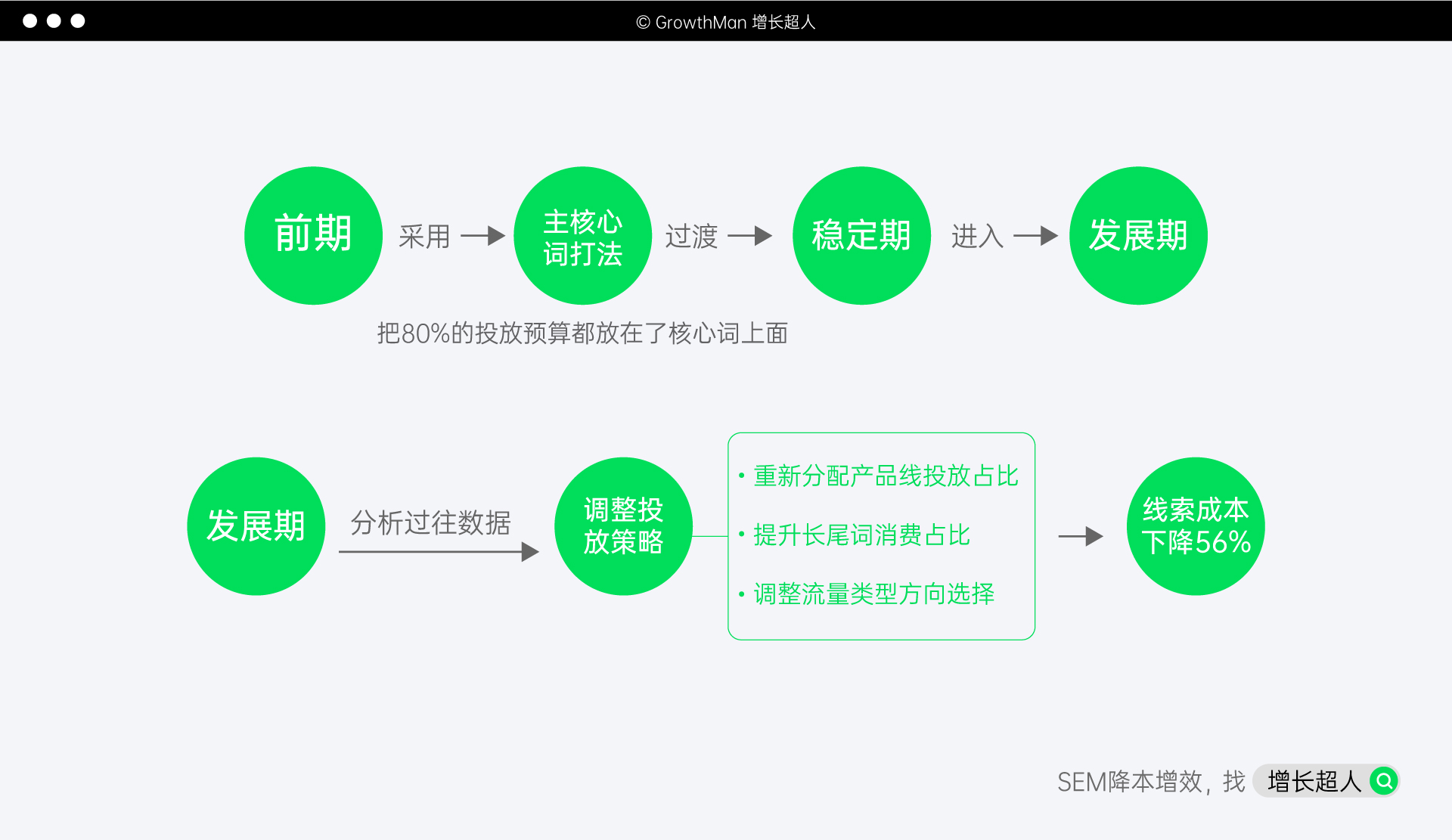增长超人为客户做的从来都不仅仅是托管SEM账户,而是为企业提供从营销策划到落地的一整套互联网解决方案。SEM运营只是一部分,我们真正的价值在于能够帮助企业找到正确的竞争优势,扭转高成本低转化的现状,实现营收增长。