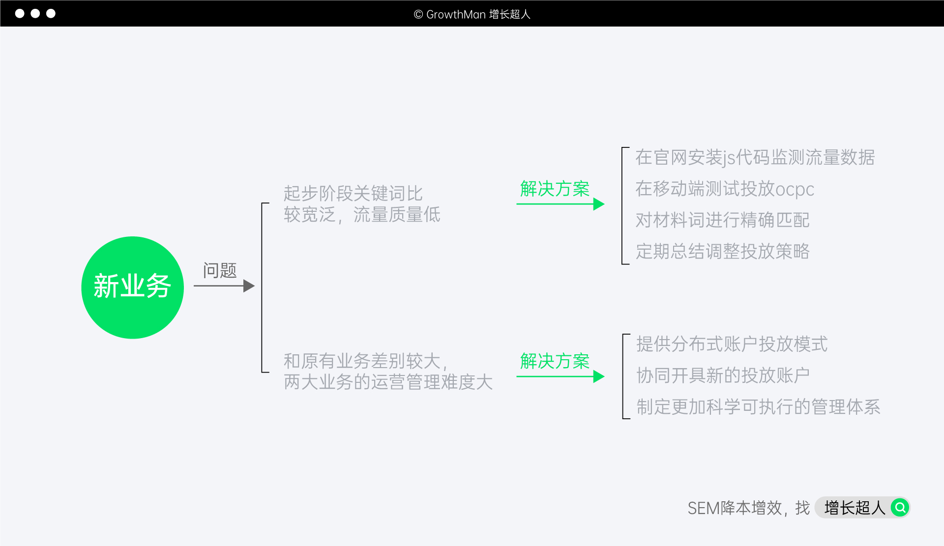 由于新业务和原有业务市场方向差别较大,两大业务的运营管理难以统一,很容易造成了管理混乱,操作不便的局面。为此我们提供分布式账户投放模式,协同雅式开新的投放账户,分别运营,并制定更加合理实用的数据整理分析、账户调整、运营操作管理体系。