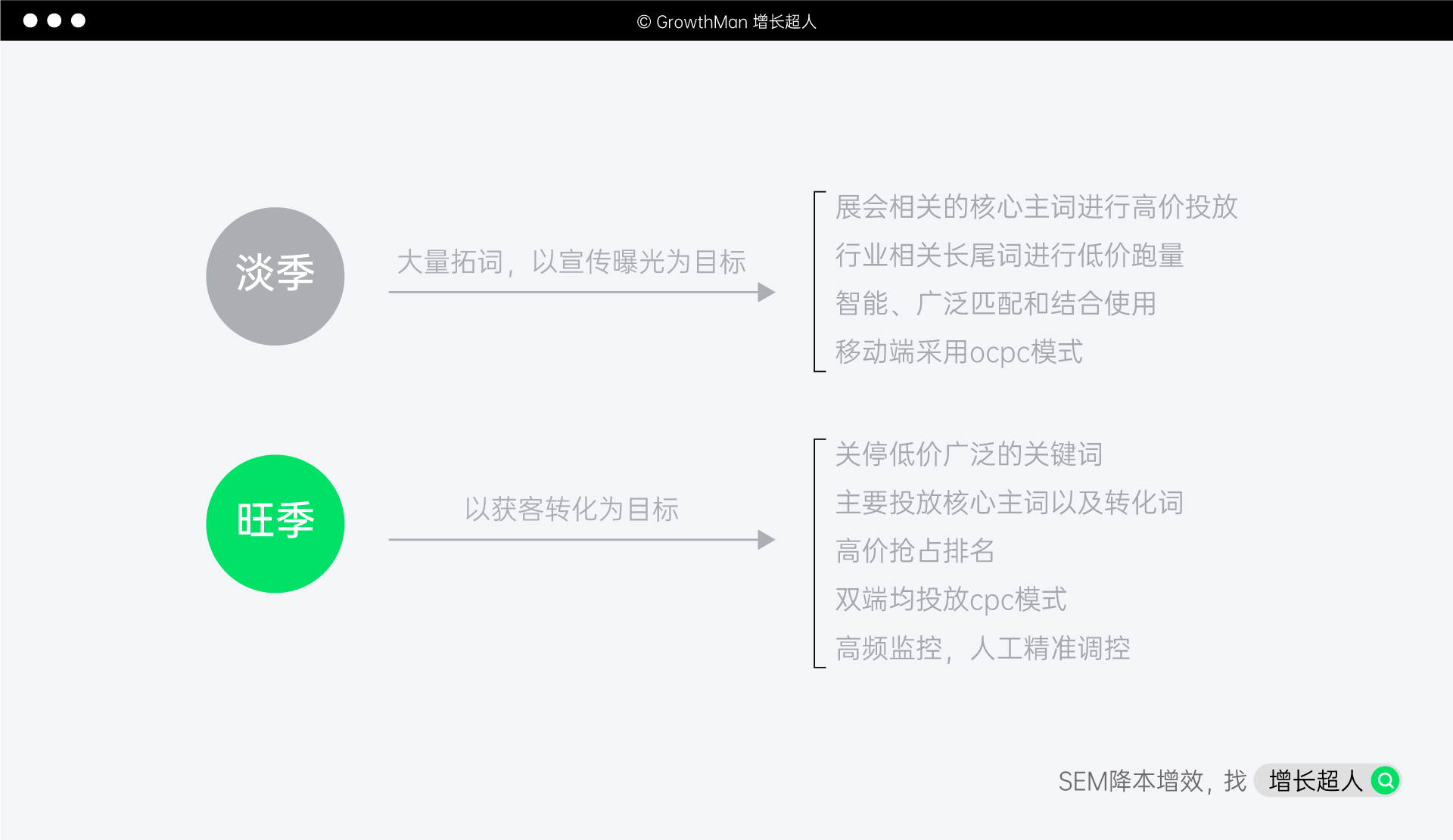 进入到开展内1-2个月的旺季阶段,则主要以获客为主,关停低价广泛的关键词,主要投放核心主词以及转化词,并高价抢占排名,双端均投放cpc模式,人工手动精准控制,提升转化!