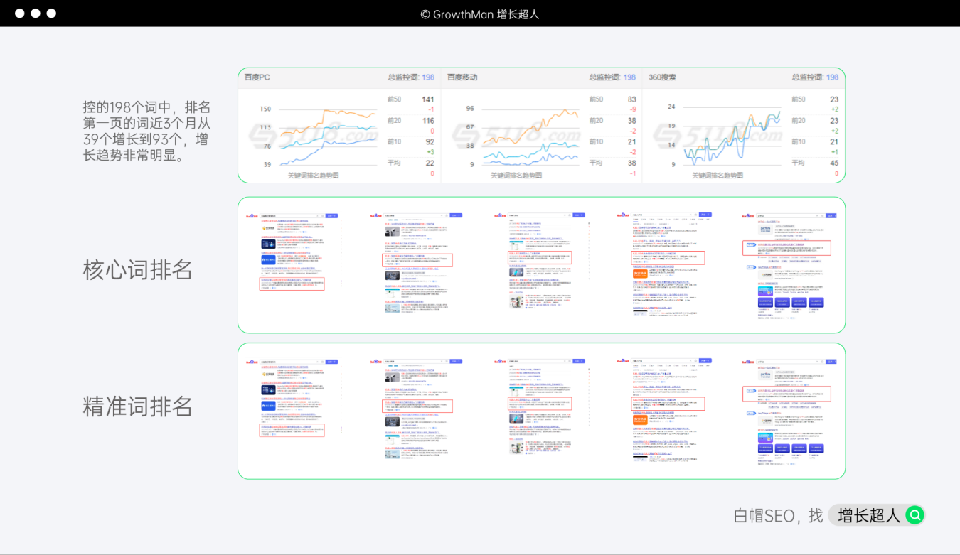 回到鲁邦通的SEO项目,我们接手其项目后进行得是比较顺利的,一方面是有SEM推广的经验帮助我们快速找准优化方向,另一方面是我们长久以来的SEO优化经验,找准关键词词组的重要性。另外我想和诸位再次分享的一个观点是,“关键词排名”是手段,“客户转化”才是目标。我们后续进行的所有优化动作,也正是基于这个观点而进行推进的。