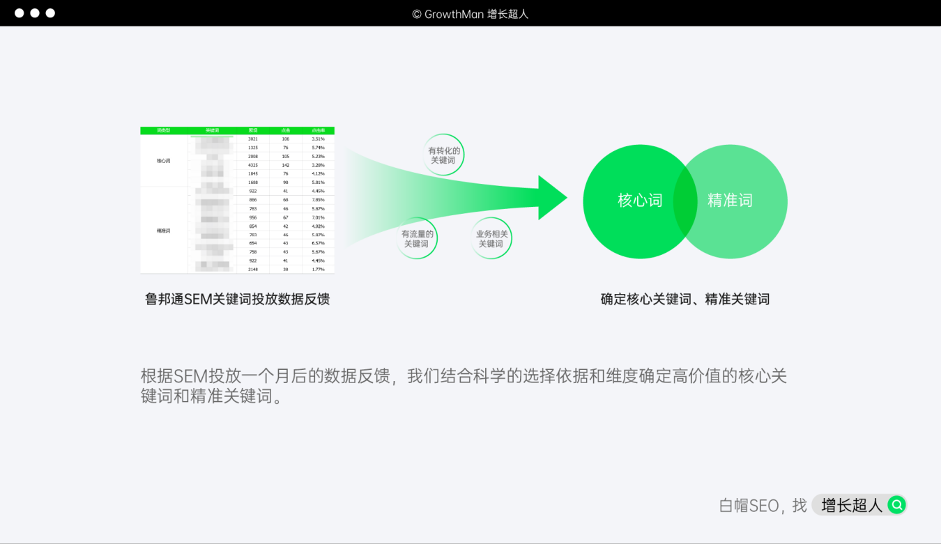 由于我们为鲁邦通除了提供SEO优化服务,还提供SEM投放服务,我们第一时间借助SEM投放的方式进行关键词价值验证,将SEM投放的数据经验复用到SEO优化上。我们通过几千上万个关键词的多轮投放,在很短的时间内拿到了核心的转化数据,通过核心转化快速确定当前关键词优化方向,找到其中的重点优化关键词,并将其按照核心词、精准词、长尾词的分组形式进行分组,成功找准了为鲁邦通能实际带来业务增长的高价值流量方向。