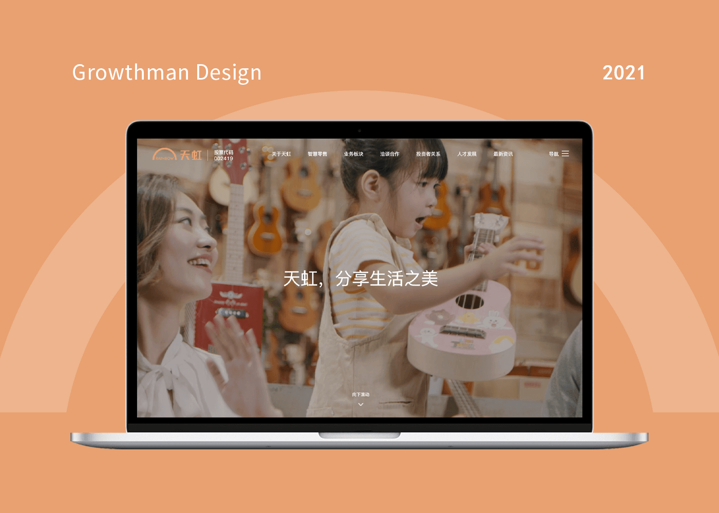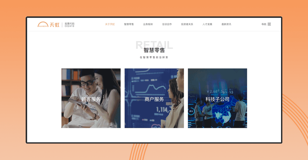 在首屏接着往下,一句精简的文案充分阐述了“天虹,分享生活之美”的品牌使命,同时应用了天虹logo一抹橙色极简的“彩虹”元素,把品牌基因融进网站交互与视觉设计,能让用户自然地产生与品牌间的联想,加深品牌印象。