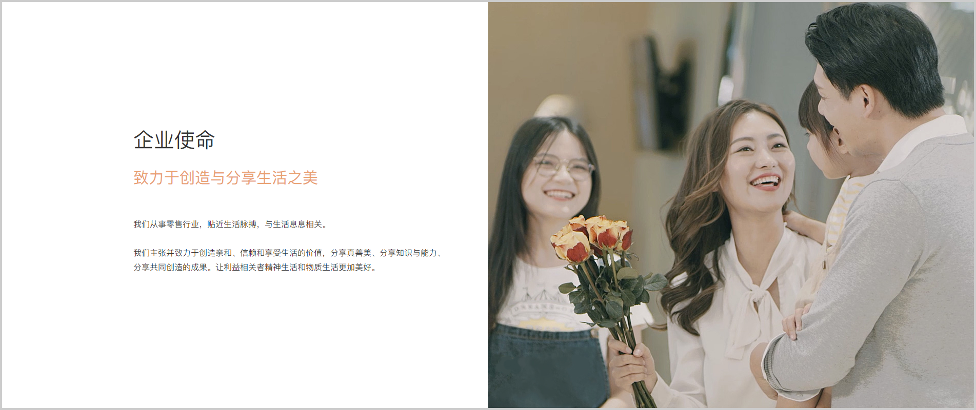 一进入天虹的新官网,首屏上,一句“天虹,分享生活之美”的slogan配合自动播放的短视频,点明了天虹十余年以来一直坚持的品牌使命,天虹对自己品牌核心价值的阐述,也穿插在新官网的各个版块中。