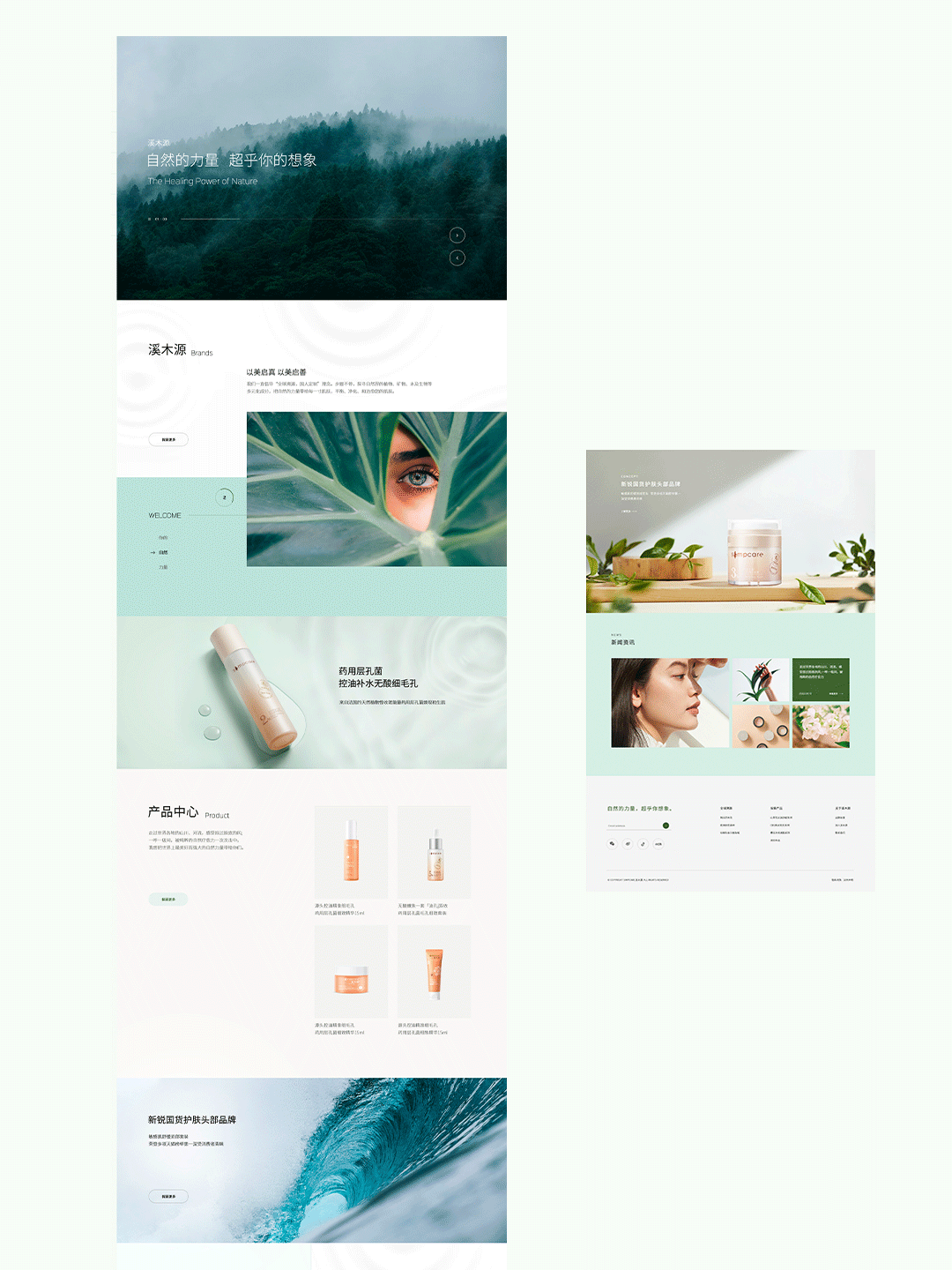 在文案方面,页面的宣传语我们都运用了言简意赅的文案,给予用户最有诗意的画面,直击心灵。文案的设计我们使用产品思维的理论为指导,因为文案不是冰冷冷的,而是令人直击痛点的话语让人留下深刻印象,从而产生商业价值。例如简短的一句“自然的力量,超乎你想象”,囊括了企业想传达的理念。