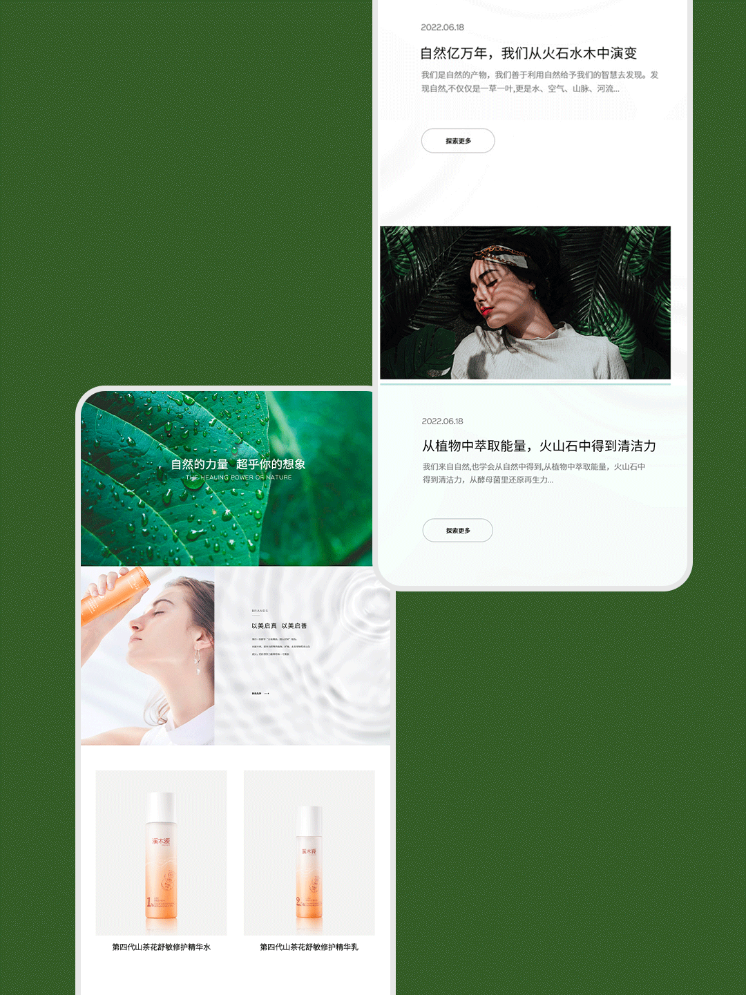 为了使视觉更好的传达企业对“自然”的理念追求,我们将网站整体视觉设计得十分干净,以及搭配高级感的色调、细致入微的交互设计,给访客舒适的观感体验。所以,在颜色上我们使用了柔和的浅绿色调作为主基调,减少深色以及有尖锐感的元素使用,让用户在浏览时对网站具有舒适与信任感;我们将所有视觉上的设计都贴近自然,创造放松的用户体验。