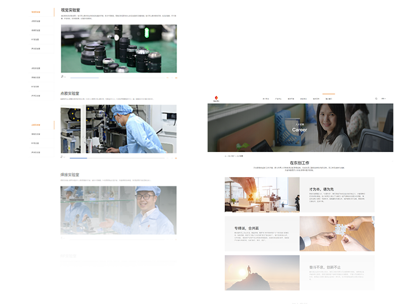 我们在介绍东创实验室的版块中,将各种分类的实验室平铺在了同一页面。访客浏览各个工艺实验室时只需向下滚动鼠标即可获取所有信息,无需一一点开,不仅仅操作效率上得到提升,还减少了跳出率。