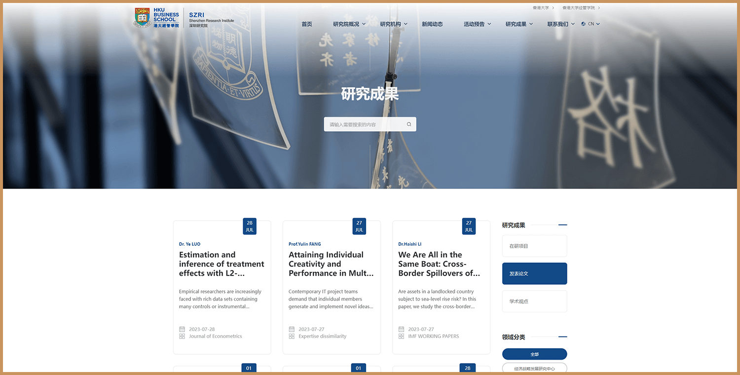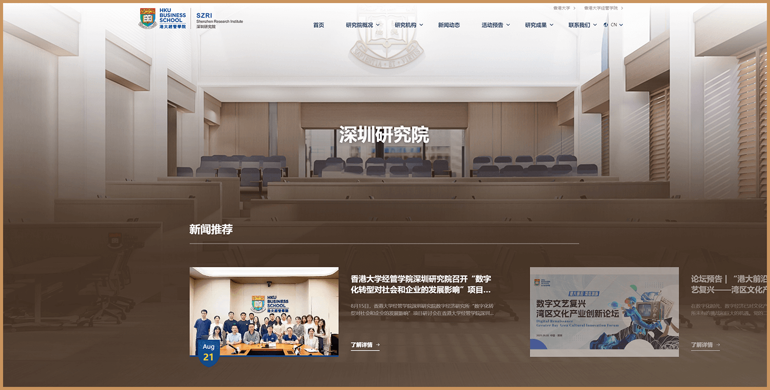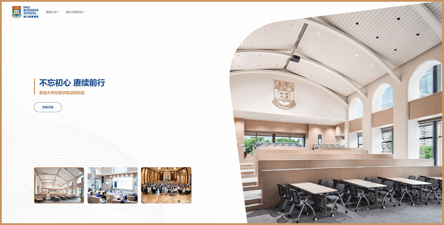 整个项目中,我们始终以满足港大需求的同时,结合了我们调研200+所国内外高校后的定调,帮港大建立一个富有浓厚学术气息和校园风采的经管学院深圳校区官网,港大非常满意我们的设计出品和落地成果。