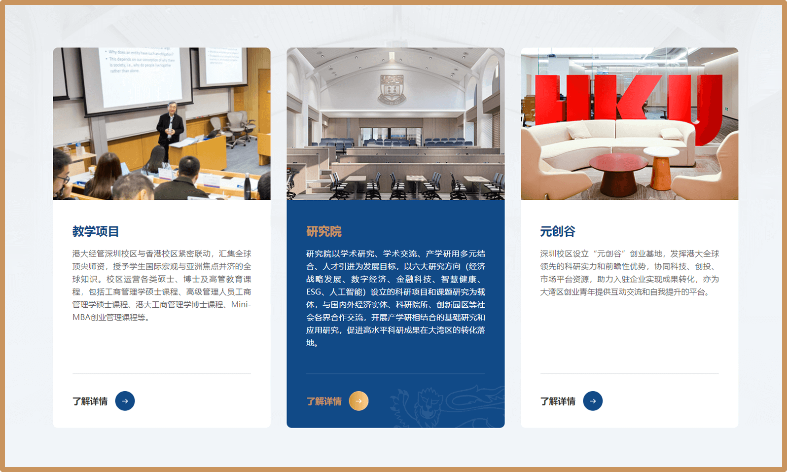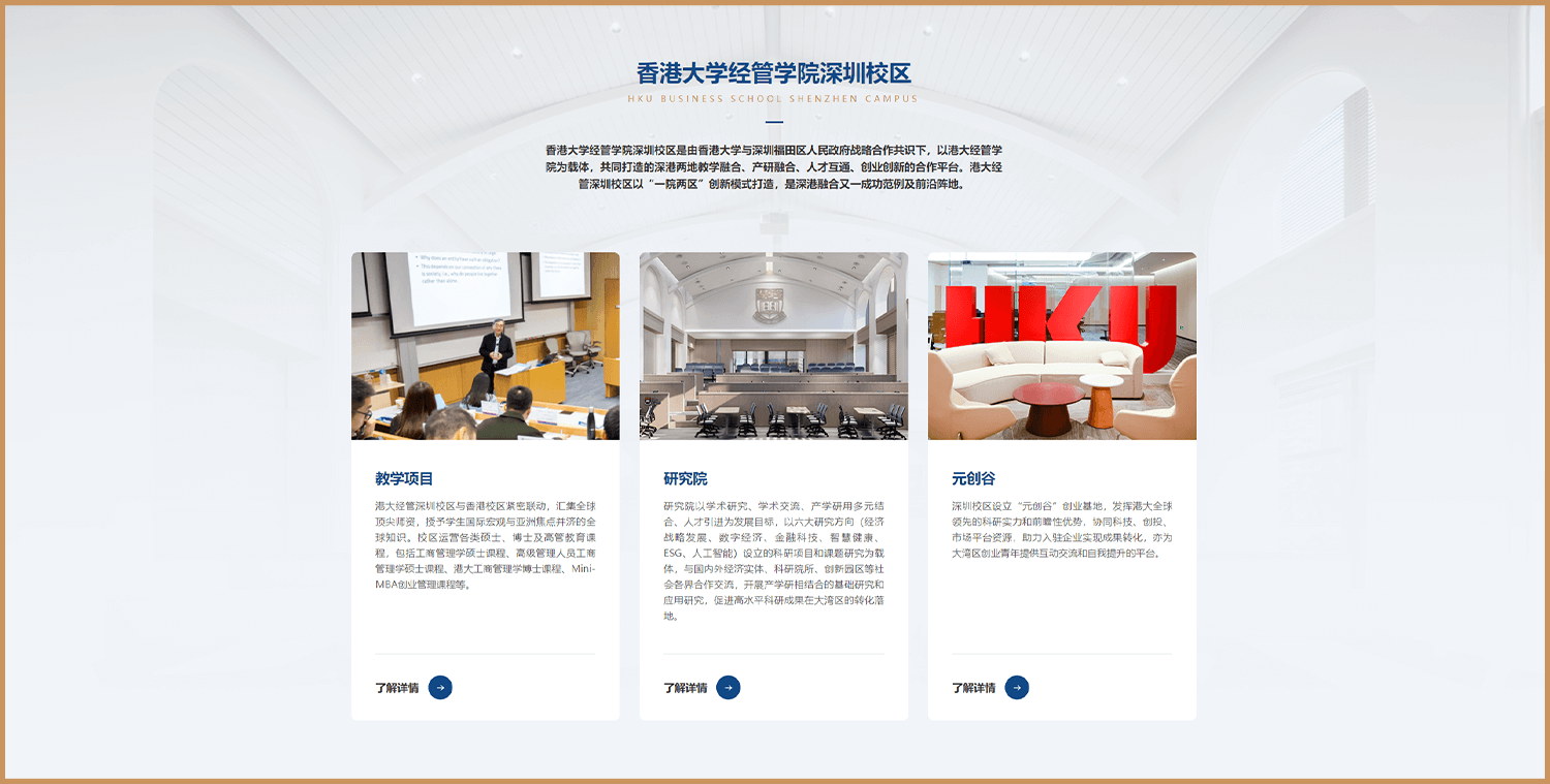 可以看出在整个项目的视觉方案上,我们更偏向于明亮且大方的视觉感受,不管是在图片的选择上还是各板块的设计上,港大经管学院深圳校区的首页我们采用了较为简约大方的设计结构,首屏以异型满屏图片展示其校区风采。