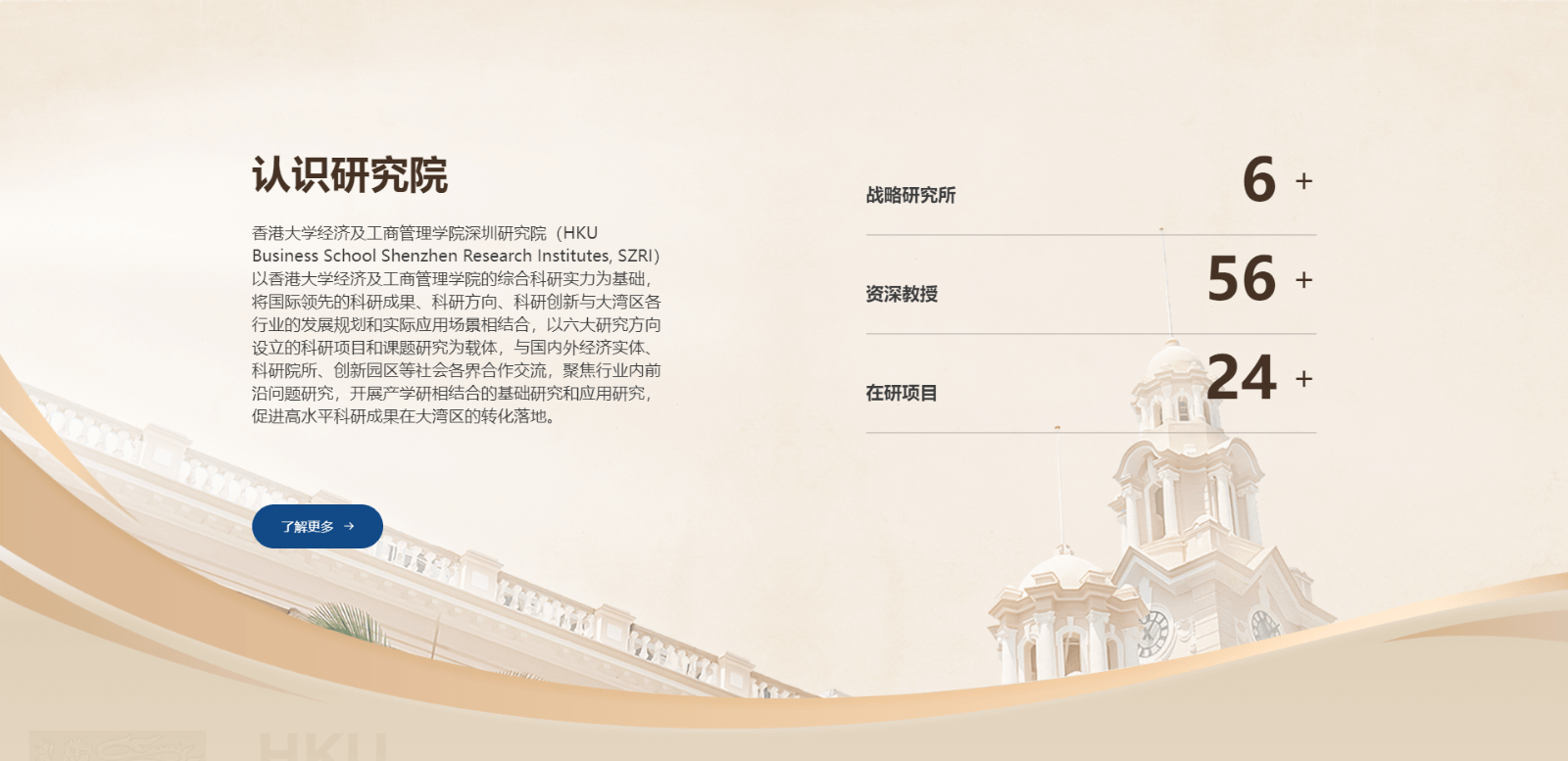 【研究院】是指香港大学经管学院深圳研究院,其以实用型研究为主,链接大型企业,或有发展潜力的特色型企业,通过案例、会议讨论等,对产业发展、政策制定、技术改革等提供战略方向建议。 是港大在深港两地教学融合上的重要组成。