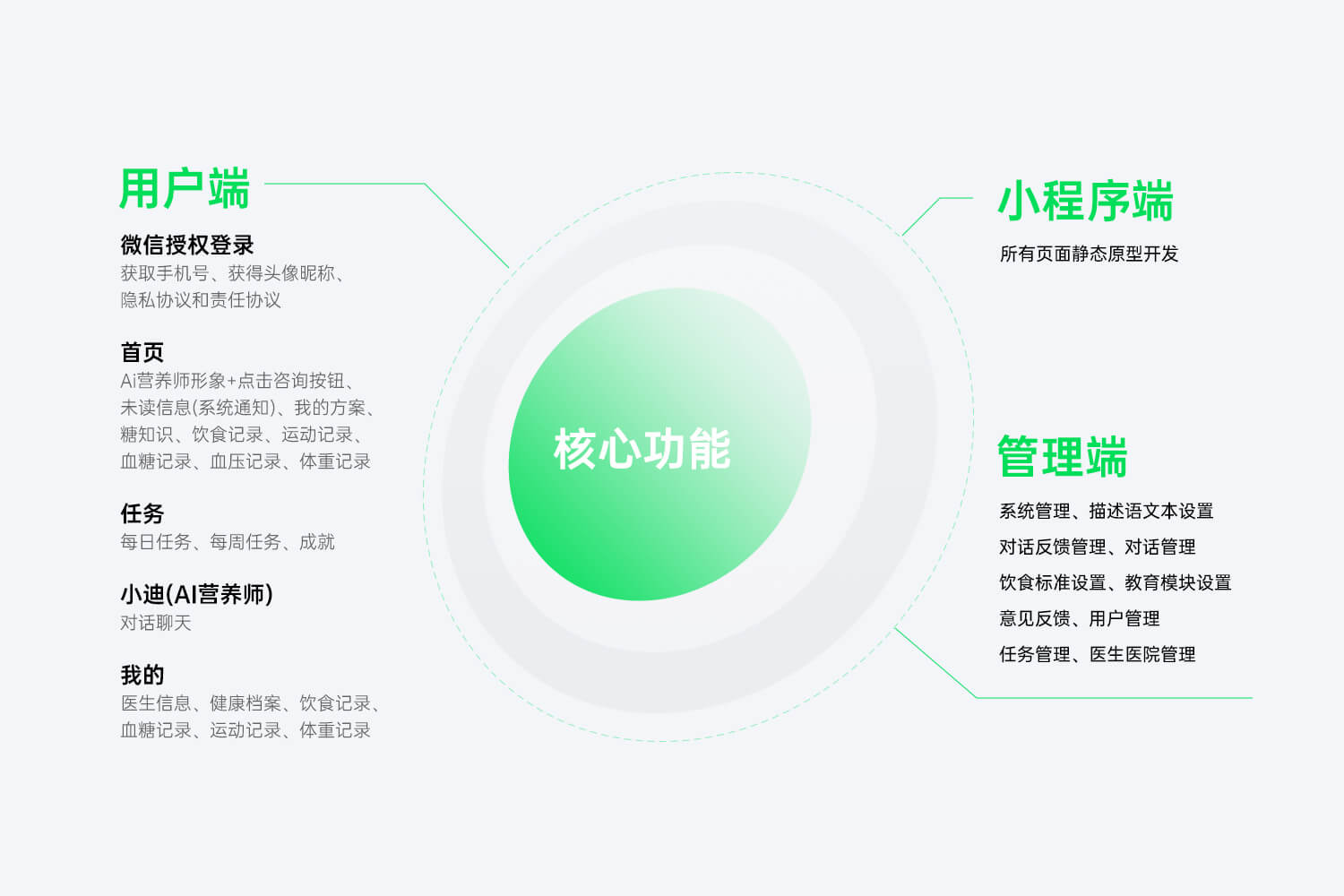 于是,我们首先进行市场调研和项目分析,帮助食医伴侣锚定目标人群,确定项目的核心需求:目标用户需要食医伴侣能根据身体信息给出饮食方面、运动方面、以及控糖方面的方案,并每个月记录身体信息生成月报。它应该围绕核心功能——AI营养师(一个能够提供个性化的饮食和营养建议的AI对话机器人),来构建其功能列表。