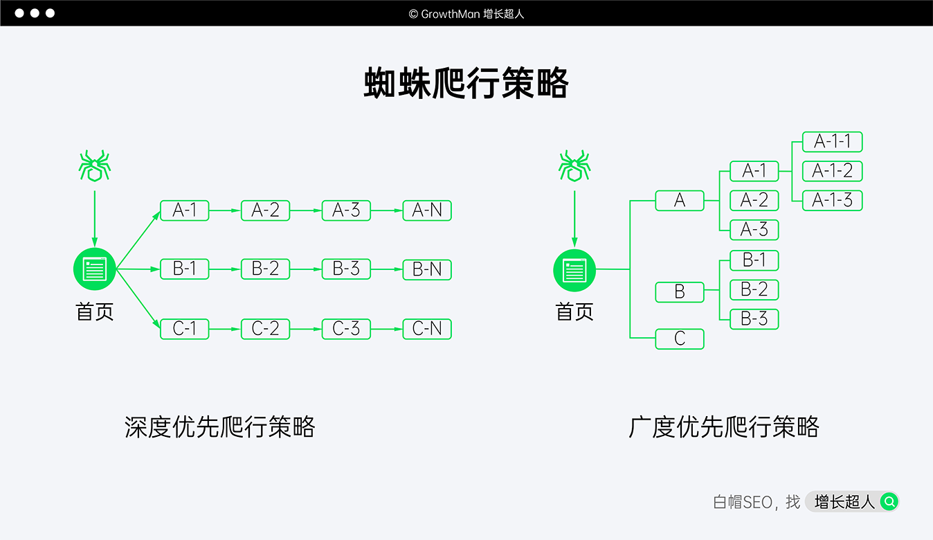 搜索引擎每天都要存入海量的数据,为了节约成本去抓取最有价值的信息,有了根据网站的权重排名提出来的蜘蛛爬行策略,分为深度优先和广度优先爬行策略。
