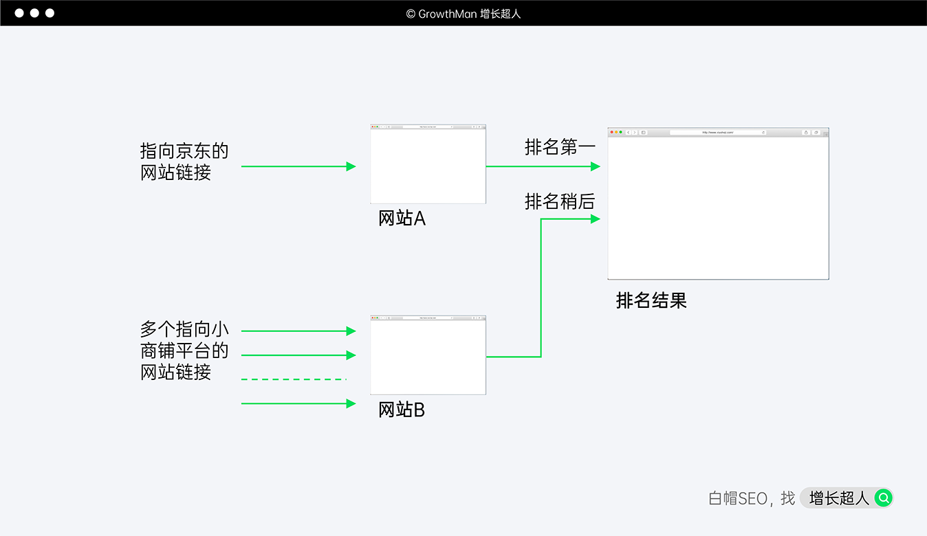 例如,你有一个买电子产品的页面,它有两个链接,一个来自京东,一个来自小店铺的平台,显然,用户则会点击来自京东的网页链接。因为我们认识京东,它在网络上的排名靠前,自然拥有更多的话语权。