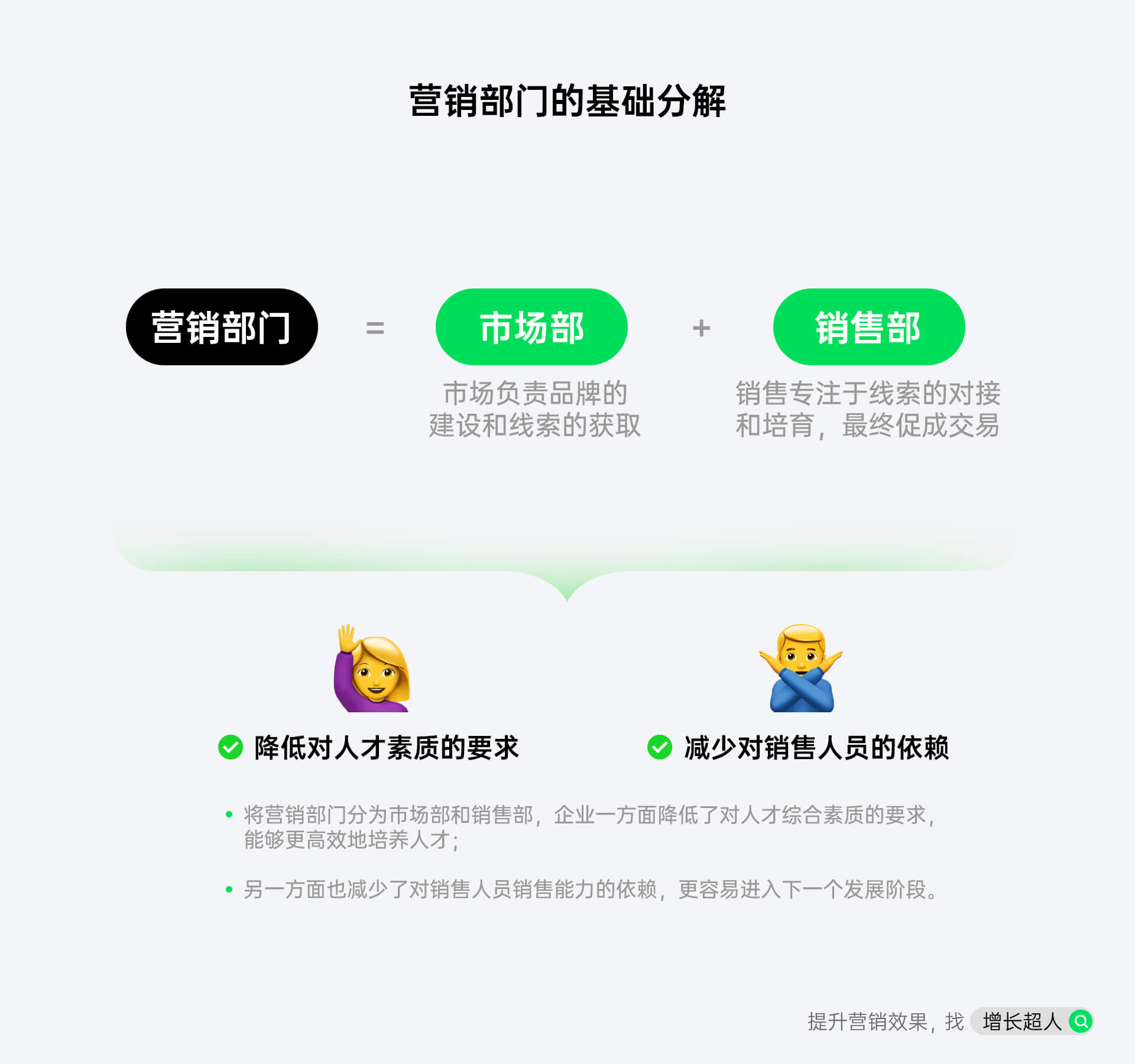 #将企业的营销工作进行细化,市场部主要负责品牌建设和线索获取工作。