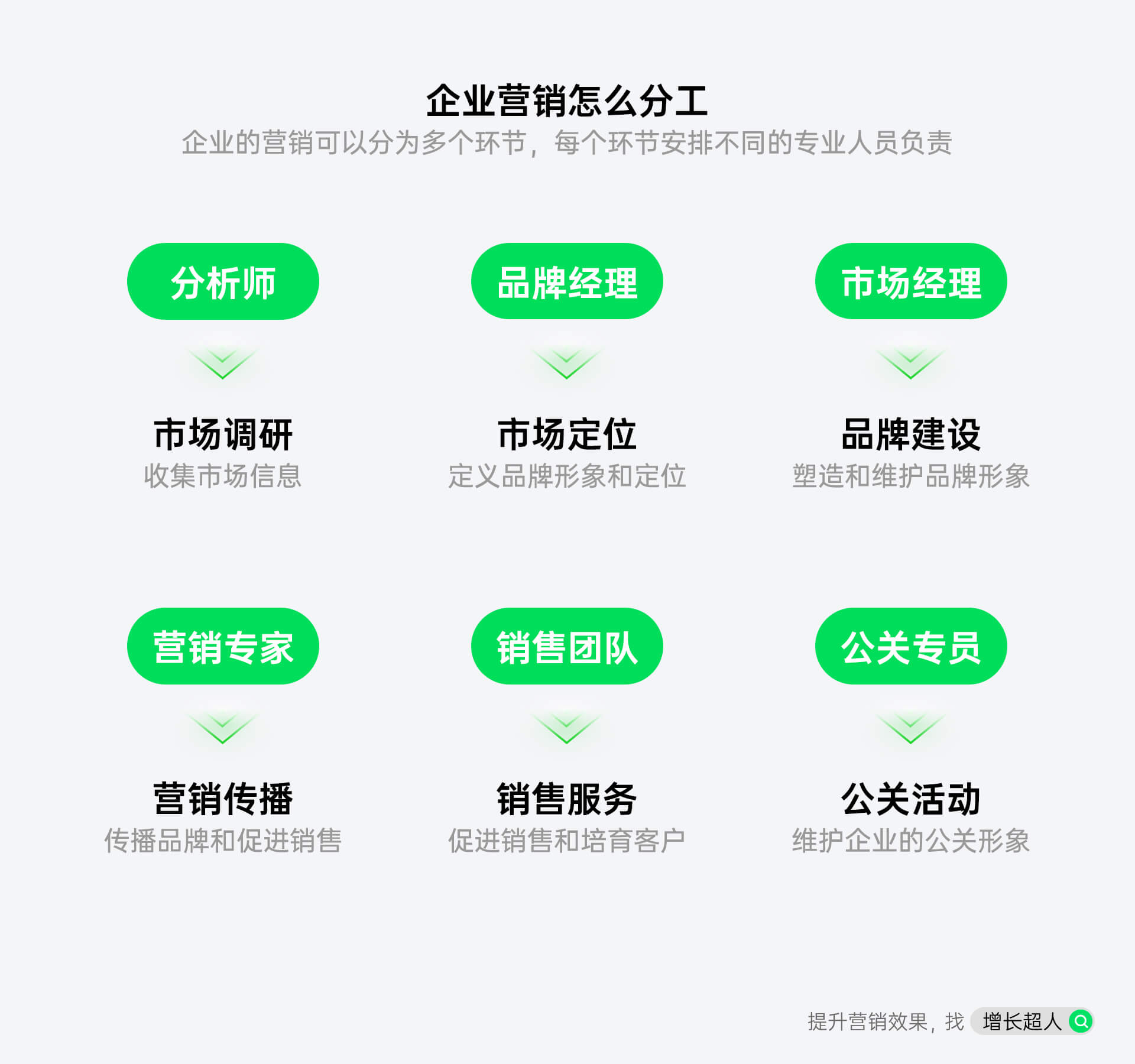 我们尝试分解企业营销的整个流程,具体可分为市场调研、市场定位、品牌建设、营销传播、销售服务、公关活动等多个环节,每个环节安排不同的专业人员负责。这样做的好处是,各环节的工作人员可以更加专注于当前的工作职责,推广人员只需负责获取咨询线索,销售人员只需专注于签单。