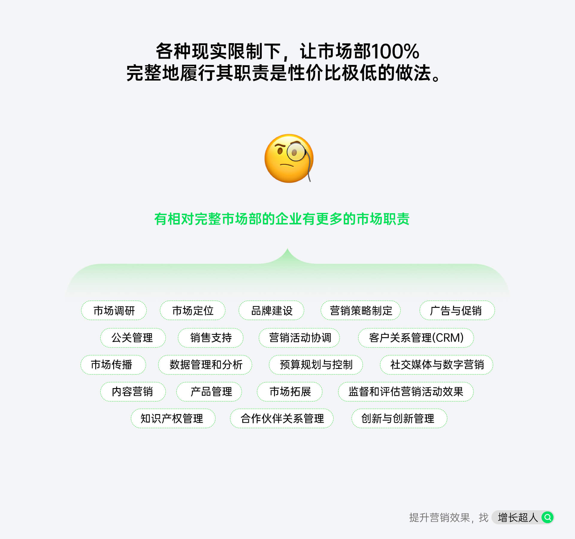 对于中小企业来说,“从0到1”地组建市场部是一项艰巨的任务,不仅需要经验丰富的市场营销人才和充足的资金,还需要大量的时间来使其运转。而对于已经拥有相对成熟市场部的企业来说,让其 100%完全履行市场职责也是性价比极低的事情。