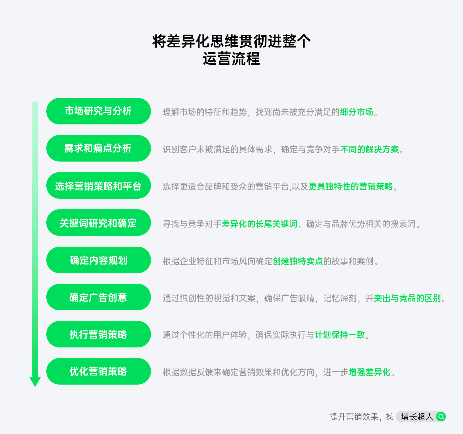 确定用户的真正需求和痛点,需要服务团队具备极高的专业能力。虽然有不少团队也能做到这一点,但我想强调的是,增长超人将差异化思维贯彻进整个运营流程。
