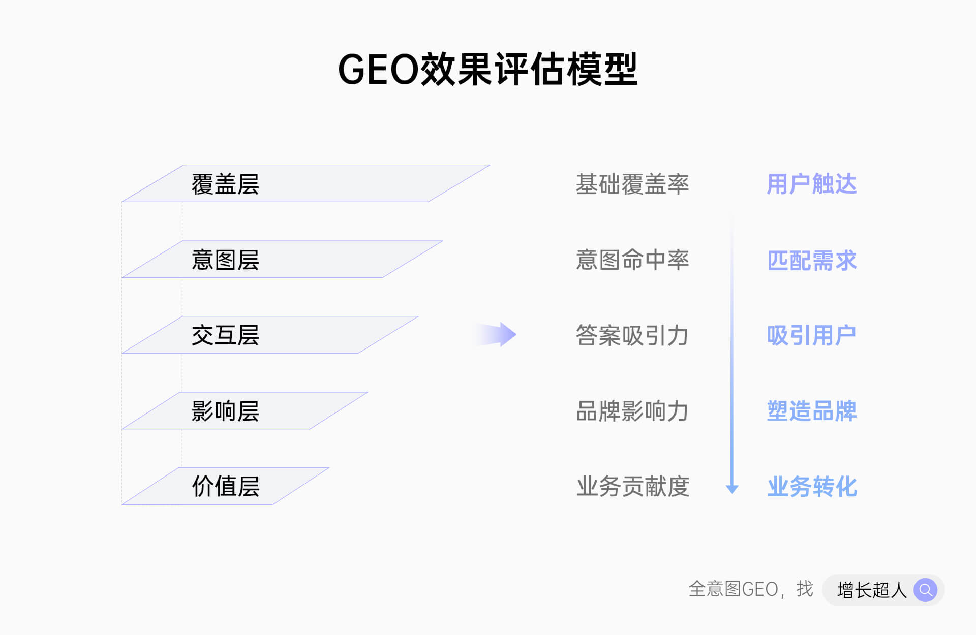 传统GEO的核心局限,是仅聚焦L3“筛选供应商”环节“单点捞流量”,错失L1-L2前置心智植入的80%机会,即便获取线索,也因缺乏前期认知铺垫难以转化。巧驭GEO依托增长超人“搜索意图五级分层模型”与“内容营销效果评估五层金字塔模型”,构建“全意图内容渗透+可量化效果验证”闭环,实现从“流量投机”到“资产沉淀”的转型,这种渗透式增长远比硬冲排名更具可持续性。