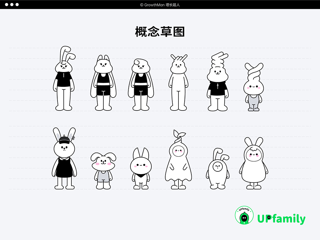 然而,经过进一步的探讨和对比,我们发现侦探角色虽然与立意相符,但放在增长小分队整个团队中似乎缺少了一些东西。为了解决这个问题,我们进行了深入的推敲,并绘制了大量风格迥异、具有独特辨识度的小兔子形象,用于进行比对和探索。