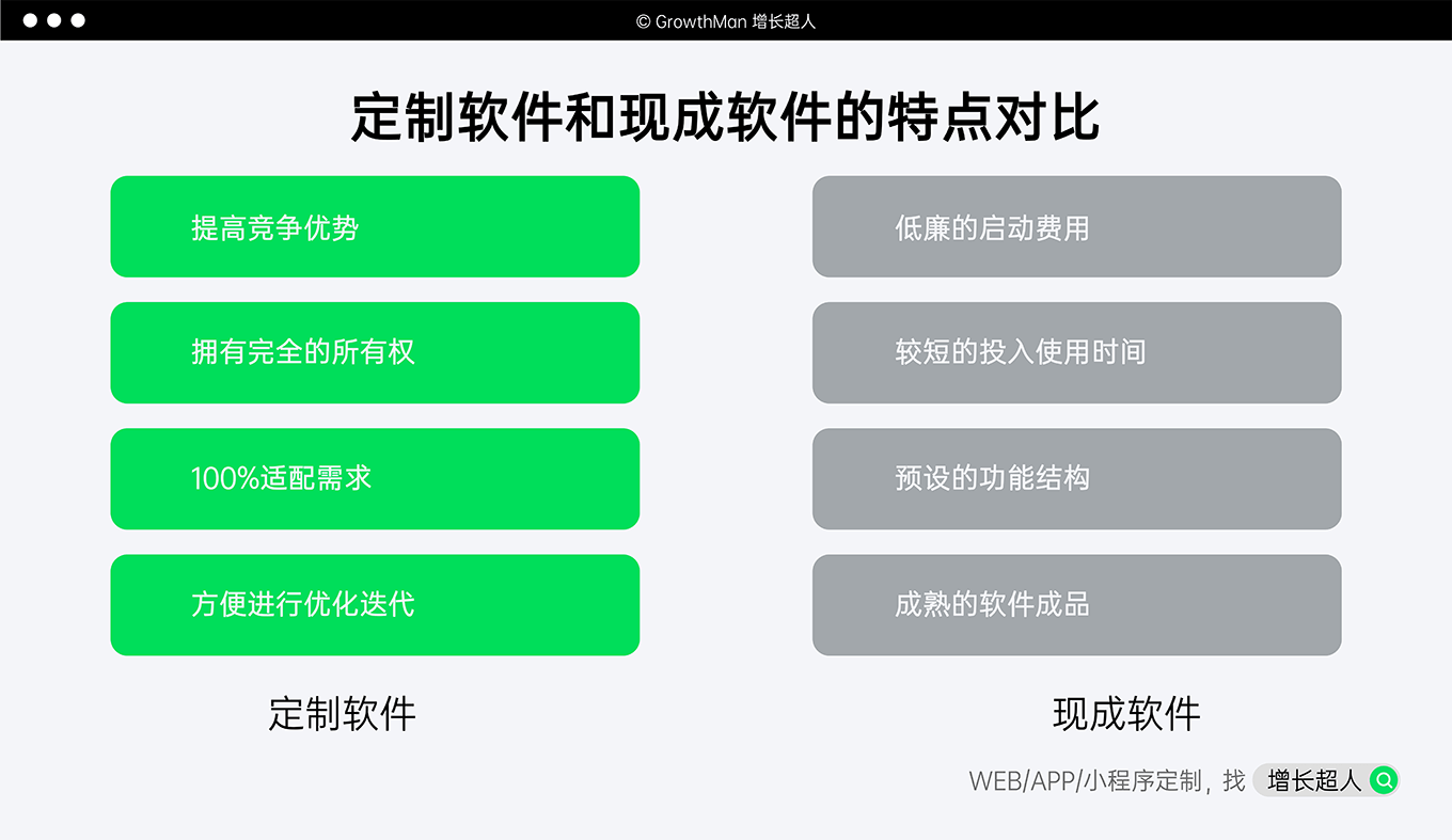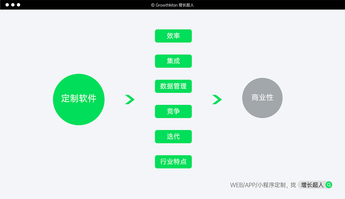 好了,以上就是定制软件的大概开发流程。事实上,对于企业而言,应该选择现成软件或者定制软件并不是一件难事,通过上面的解释大家也对定制软件的优势和流程有了相对具象的了解。但我知道大家其实对于选择哪家定制软件开发商这个问题比较头疼,因为我们增长超人本身也提供定制软件开发服务,这里就不提供说服力较低的选择教程了。简单向大家介绍一下增长超人提供的这项服务吧。