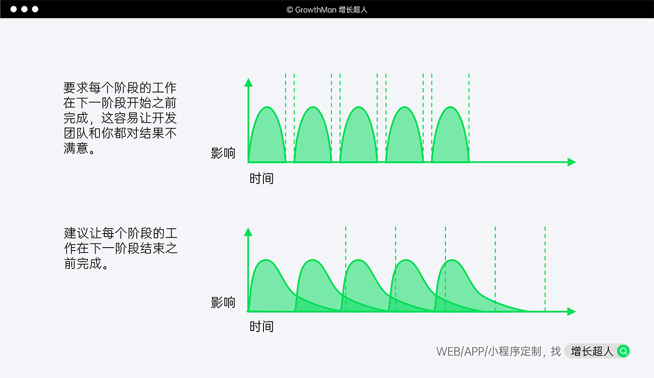 完成准备工作后,开发团队就开始定制软件的开发。软件开发流程一般包括定义规划、需求分析、软件设计、程序编码以及软件测试,共计五个阶段。在理想状态下,我们会要求每个阶段的工作在下一阶段开始之前完成,这其实很容易让开发团队和你都对结果不满意。因为每一个阶段的工作决策都有可能促成上一个阶段的一次重新评估,所以我们更建议让每个阶段的工作在下一阶段结束之前完成。
