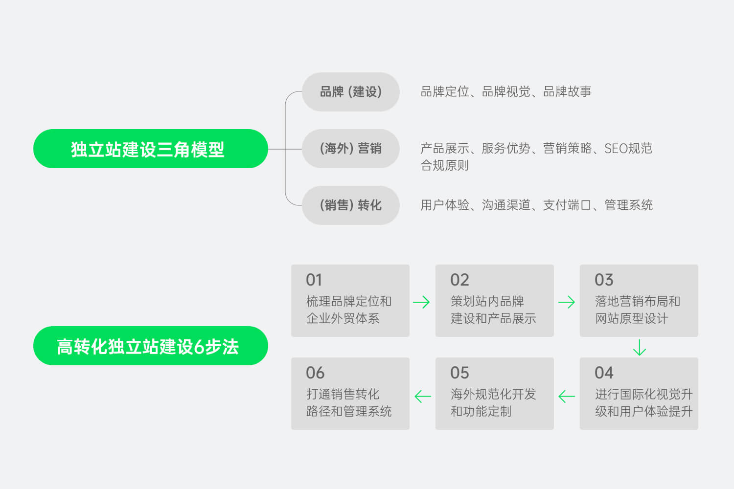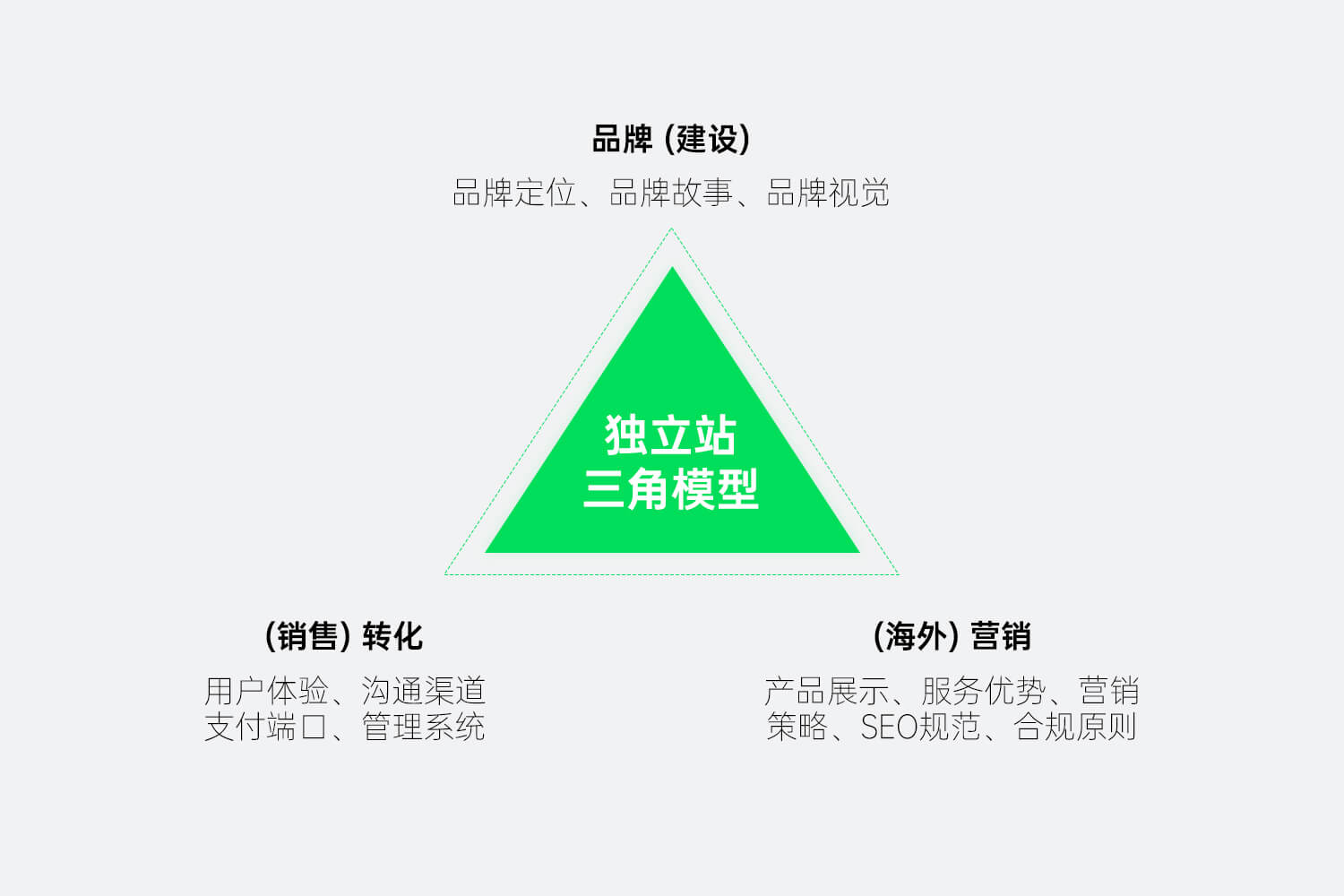 品牌(建设)、(海外)营销、(销售)转化共同构成了「独立站建设三角」,他们相互关联,缺一不可,是打造一个超强转化力独立站的必要因素。
