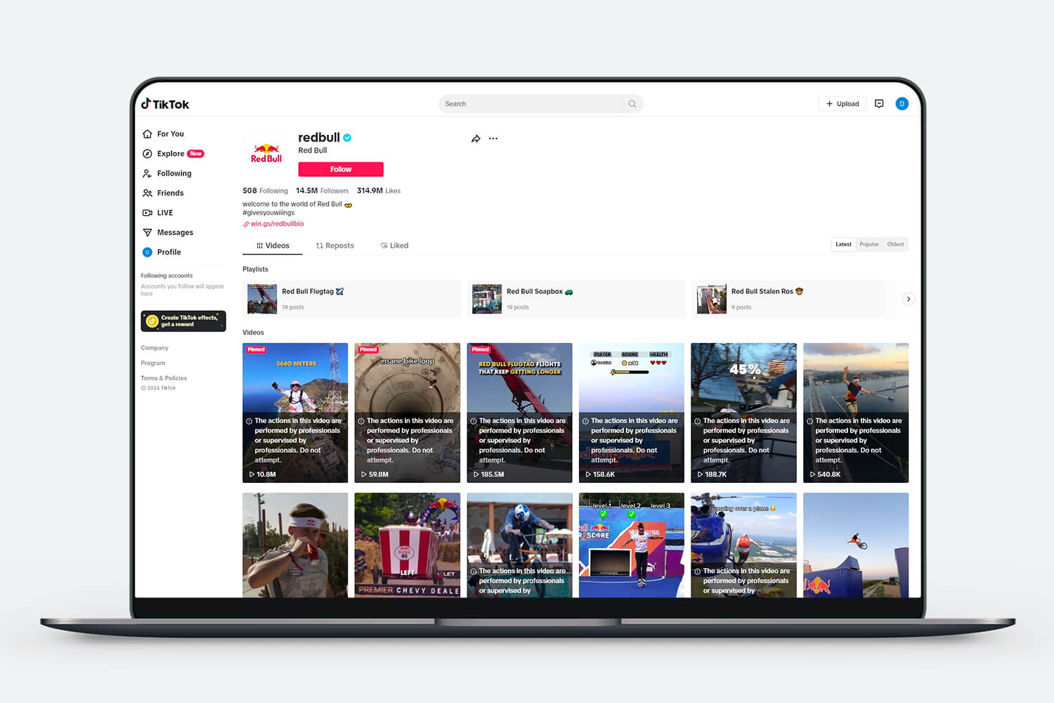 我们来看下红牛是怎么做的。红牛在Tik Tok上,并没有像以往我们记忆中的那样,一边喝着饮料一边喊出“困了,累了,喝红牛”、或者是“Red Bull 2026世界杯高清直播 Give Your Wiings”,而是像病毒般地传播#givesyouwiiings 系列极限挑战视频。